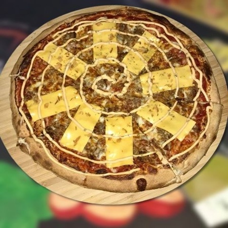 Sauce tomate, mozzarella, viande hachée, cheddar, oignons sec, sauce burger, origan. €21.00